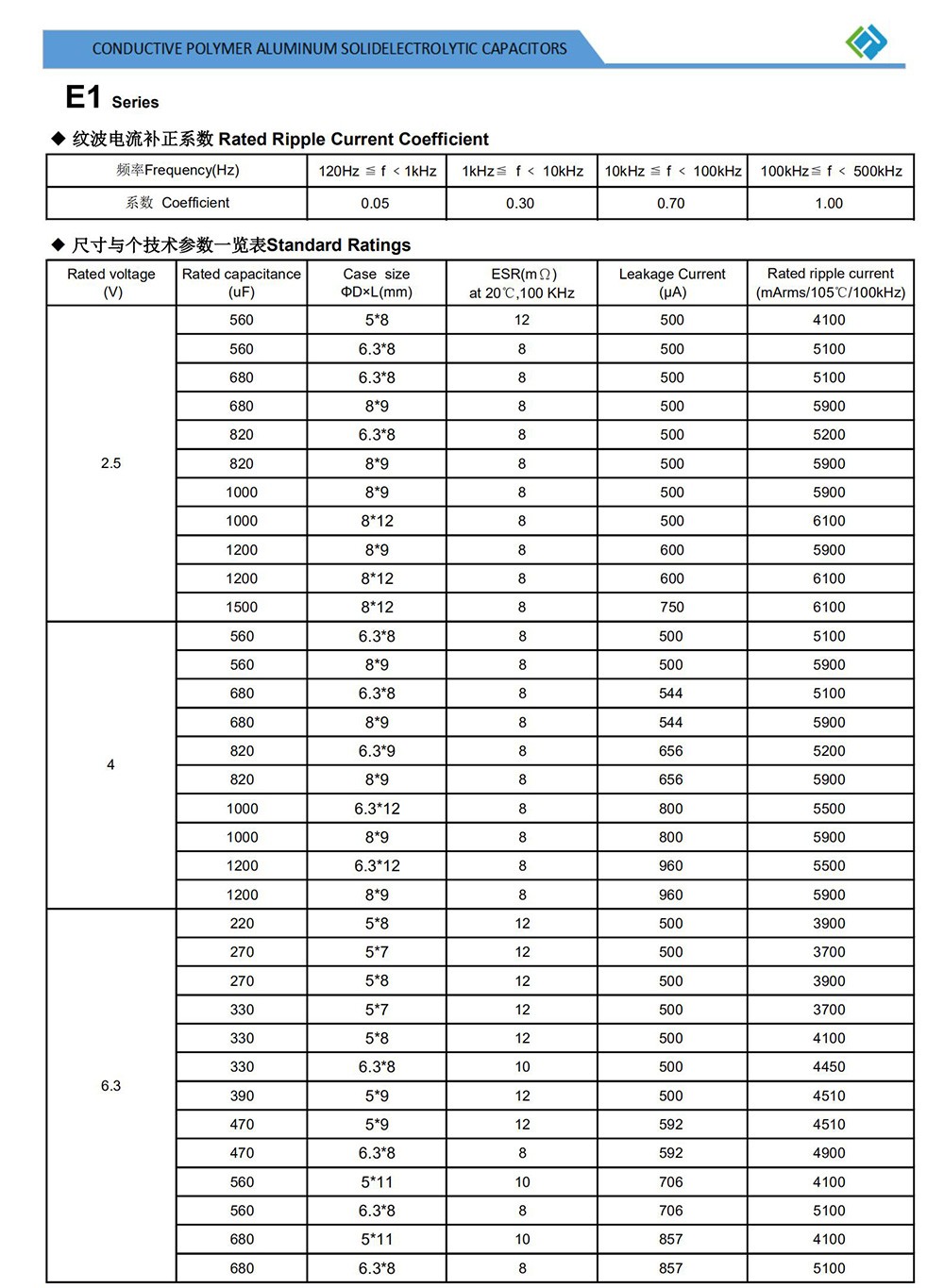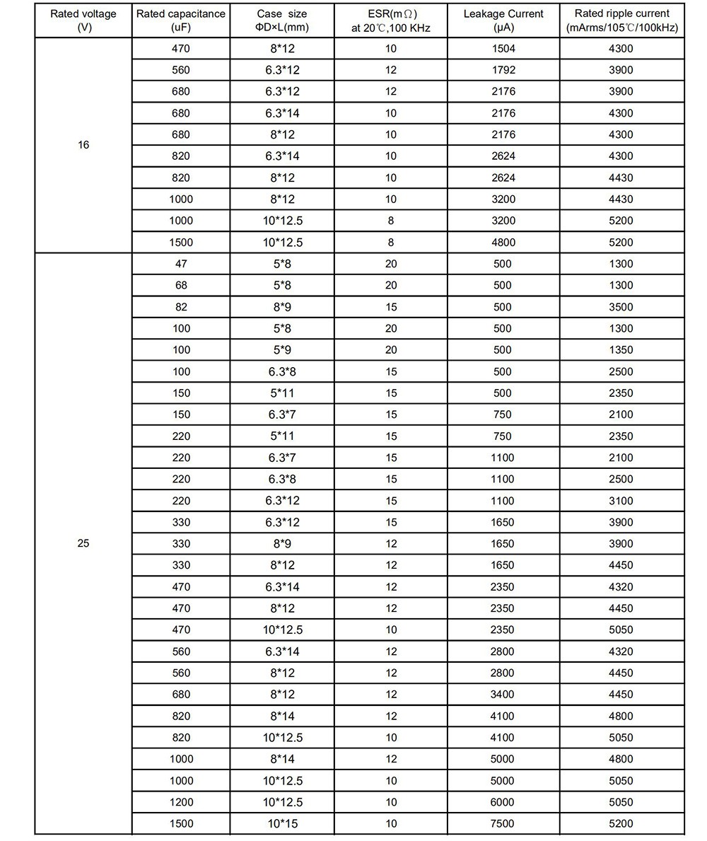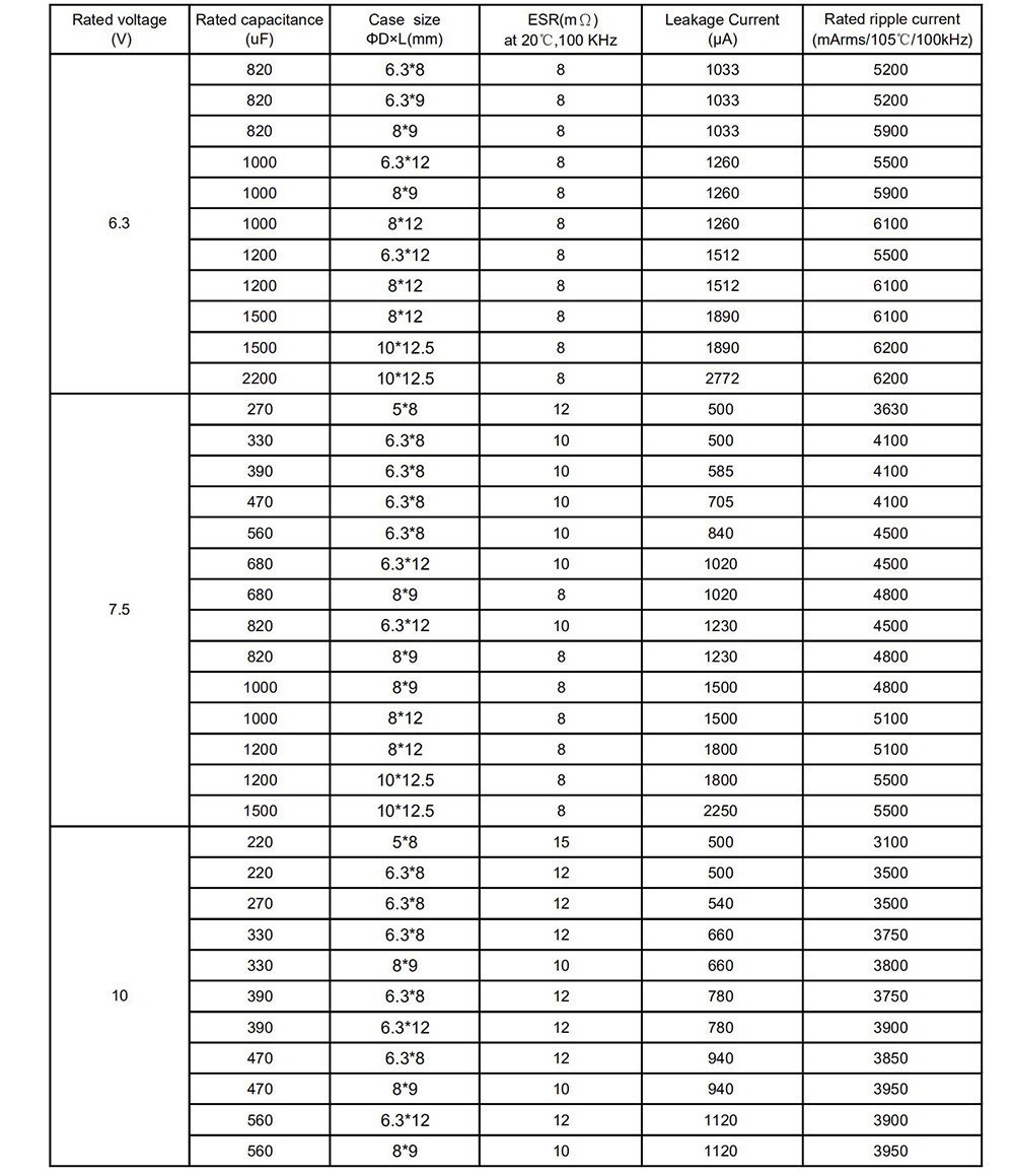 ● Super low ESR, high ripple current ● Load life of 2000 hours at 105℃ ● RoHS Compliant